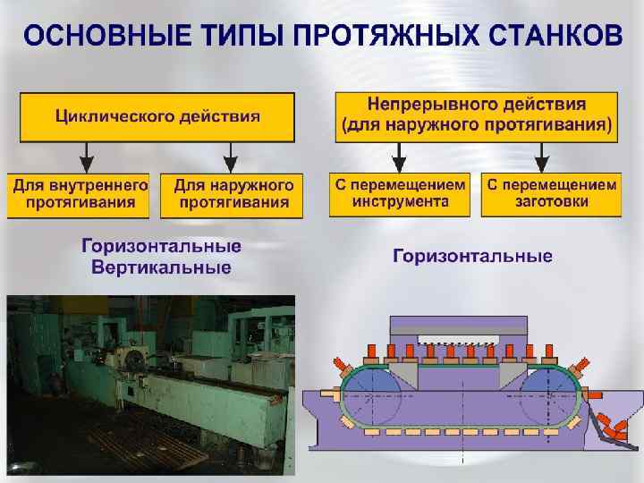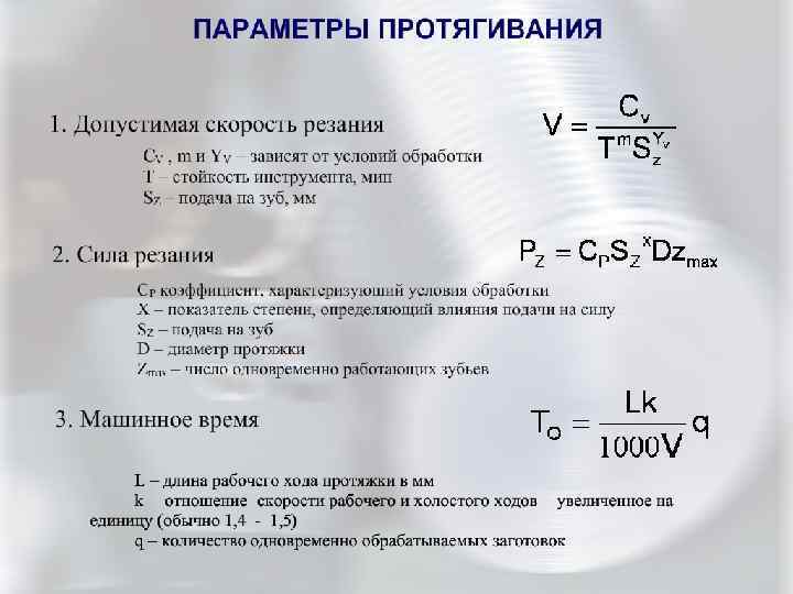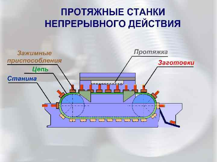ПУТИ ПОВЫШЕНИЯ ПРОИЗВОДИТЕЛЬНОСТИ ПРОТЯГИВАНИЯ. 1. 2. 3. 4. 5. Концентрация обработки (одновременная обработка нескольких поверхностей блочными протяжками); Сокращение суммарной длинны протяжки; Увеличения скорости резания; Одновременная обработка нескольких деталей; Использование специальных загрузочных бункеров и роботов.