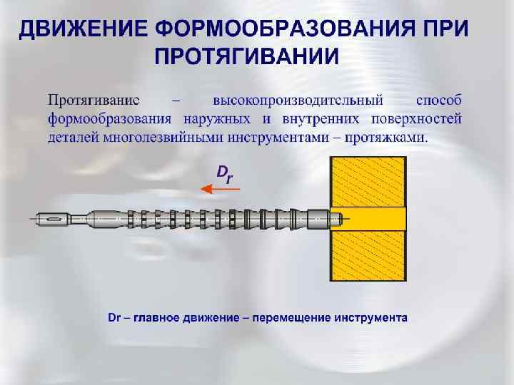 ОБРАБОТКА ЗАГОТОВОК ДОЛБЛЕНИЕМ, СТРОГАНИМ, ПРОТЯГИВАНИЕМ 8. 1. Формообразование при строгании, долблении, протягивании 8. 2. Основные понятия и определения. Технологические возможности. 8. 3. Инструменты для строгания, долбления и протягивания. 8. 4. Основные типы строгальных, долбежных и протяжных станков и инструмент для протягивания. 8. 5. Элементы режима резания при протягивании. 8. 6. Порядок расчета рациональных ПРР при протягивании. 8. 7. Пути повышения производительности труда при протягивании.