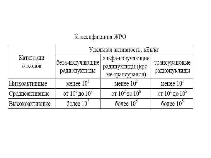 Классификация ЖРО • ЖРО классифицируются в зависимости от • удельной активности и радионуклидного состава – на низкоактивные, среднеактивные и высокоактивные; • физических и химических свойств: на гомогенные и гетерогенные; на органические (масла, эмульсии масел в воде, растворы детергентов); на неорганические, в том числе: малосолевые водные растворы (с концентрацией солей менее 1 г/л), высокосолевые водные растворы (с концентрацией солей более 1 г/л)
