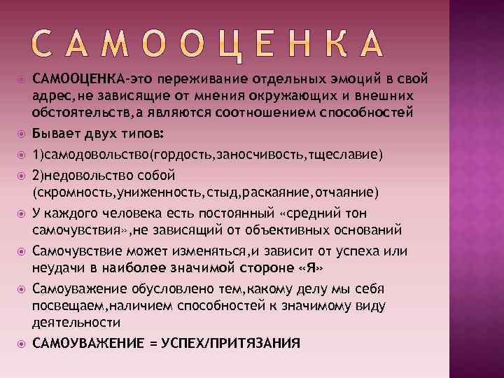 САМООЦЕНКА-это переживание отдельных эмоций в свой адрес, не зависящие от мнения окружающих и внешних обстоятельств, а являются соотношением способностей Бывает двух типов: 1)самодовольство(гордость, заносчивость, тщеславие) 2)недовольство собой (скромность, униженность, стыд, раскаяние, отчаяние) У каждого человека есть постоянный «средний тон самочувствия» , не зависящий от объективных оснований Самочувствие может изменяться, и зависит от успеха или неудачи в наиболее значимой стороне «Я» Самоуважение обусловлено тем, какому делу мы себя посвещаем, наличием способностей к значимому виду деятельности САМОУВАЖЕНИЕ = УСПЕХ/ПРИТЯЗАНИЯ
