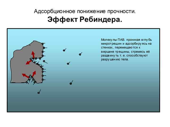 Общее снижение работы диспергирования зависит, не только от степени снижения σ, но и от наличия дефектов в теле и условий проведения процесса. Сама по себе среда не разрушает поверхность тел, а лишь помогает разрушению. В этом отличие этого процесса от коррозии, которая разрушает тело без нагрузки. Эффект Ребиндера широко используется в промышленности. Например, измельчение руды всегда проводят в водной среде в присутствии поверхностно-активных веществ (ПАВ). Качество обработки деталей на станках в присутствии эмульсии ПАВ резко повышается, увеличивается срок службы металлорежущего инструмента и снижаются энергозатраты на проведение процесса. Добавки помогают не только разрушить материал, но и стабилизируют систему в дисперсном состоянии, так как, адсорбируясь на поверхности частиц, мешают их обратному слипанию. Действие понизителей прочности специфично, то есть для определенных поверхностей подходят одни и не подходят другие вещества. Например, для разрушения твердых металлов используют жидкие металлы, для монокристаллов органические вещества, для твердых солей расплавы солей, растворы ПАВ, воду и т. д.