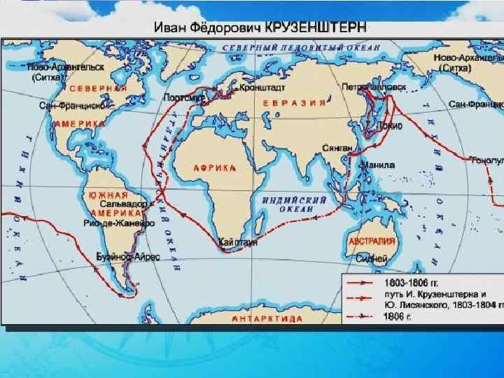 1803 -1806 – первая русская кругосветная экспедиция из Кронштадта до Камчатки и Аляски под руководством Ивана Федоровича Крузенштерна и М. П. Лазарева