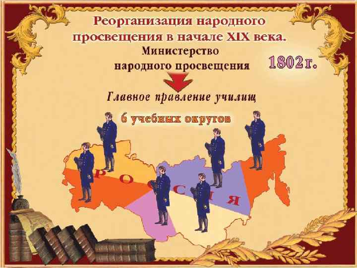 • 1802 – создано Министерство народного просвещения • 1804 – Россия разделена на 6 учебных округов. Центры округов университеты: Московский, Дерптский (открыт в 1802), Виленский, Харьковский, Казанский, Санкт – Петербургский. • Открыты специализированные учебные заведения: Лесной, Педагогический институты, Техническое училище. • 1811 – Царскосельский лицей.