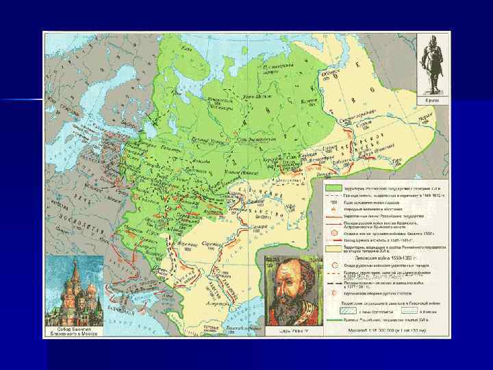 Внешняя политика Ивана IV 1552 г. - взятие Казани, 1556 г. – Астрахань, 1557 г. – Чувашия, Башкирия, Ногайская орда, 1581 г. –начало покорения Сибири n 1558 -1583 г. - Ливонская война n 1582 г. - перемирие в Яме Запольском с Речью Посполитой (Литва и Польша с 1569 г. ) – Россия отдала Ливонию, Полоцк n 1583 г. – Плюсское перемирие со Швецией – побережье Балтики, Ям, Нарва, Копорье, Корела – к Швеции n