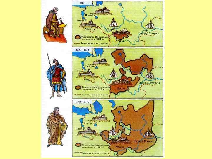 Даниил Московский Даниил никогда не претендовал на великое княжение. Пока старшие братья спорили из-за Владимира, он постепенно расширял московские владения: в 1301 г. отбил Коломну у рязанских князей в 1303 г. отвоевал Можайск у смоленских князей В 1302 г. по завещанию племянника Ивана Дмитриевича получил Переяславль