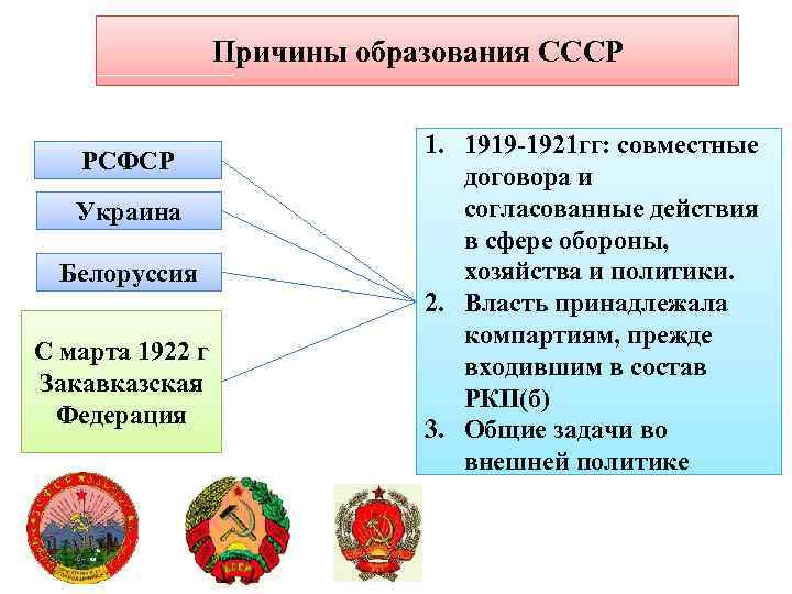 Причины образования СССР РСФСР Украина Белоруссия Азербайджан С марта 1922 г Армения Закавказская Федерация Грузия 1. 1919 -1921 гг: совместные договора и согласованные действия в сфере обороны, хозяйства и политики. 2. Власть принадлежала компартиям, прежде входившим в состав РКП(б) 3. Общие задачи во внешней политике