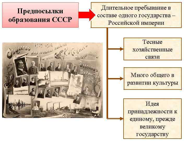 Предпосылки образования СССР Длительное пребывание в составе одного государства – Российской империи Тесные хозяйственные связи Много общего в развитии культуры Идея принадлежности к единому, прежде великому государству