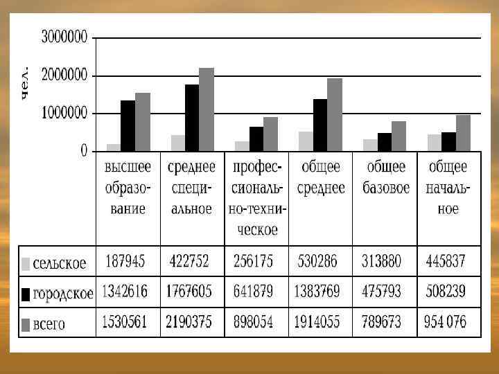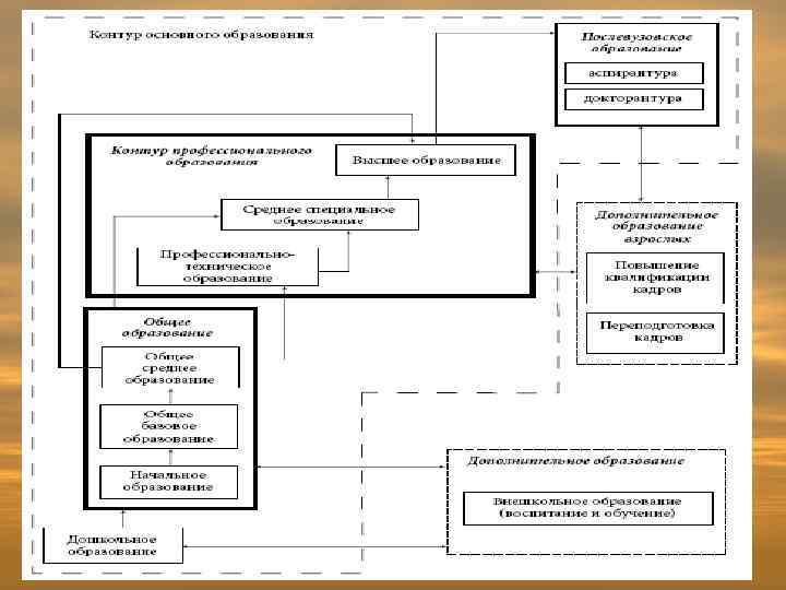 Основные ступени образования: • дошкольное (ясли, детские сады) • общее базовое (на базе 9 -ти классов средней школы). Начинается с 6 лет. • общее среднее (на базе 11 -ти классов), • начальное профессиональное (ПТУ, лицеи), • среднее специальное (техникумы, колледжи) • высшее профессиональное (высшие колледжи, институты, университеты, академии).