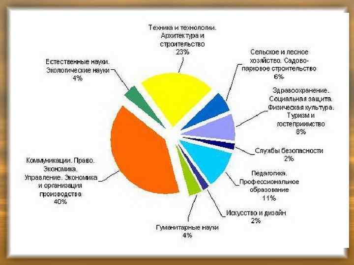 • педагогического профиля выбрали 11% всех студентов • "Сельское и лесное хозяйство. Садово-парковое строительство" решили остановить свой выбор 6% студентов, • ("Здравоохранение", "Социальная защита", "Физическая культура. Туризм и гостеприимство") - около 8% • "Естественные науки" и "Экологические науки" - по 4% • "Искусство и дизайн" и "Службы безопасности" - по 2% всех студентов.