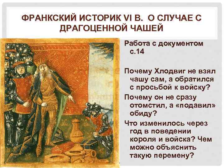 ФРАНКСКИЙ ИСТОРИК VI В. О СЛУЧАЕ С ДРАГОЦЕННОЙ ЧАШЕЙ Работа с документом с. 14 Почему Хлодвиг не взял чашу сам, а обратился с просьбой к войску? Почему он не сразу отомстил, а «подавил» обиду? Что изменилось через год в поведении короля и войска? Чем можно объяснить такую перемену?