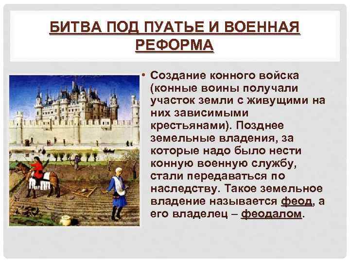 БИТВА ПОД ПУАТЬЕ И ВОЕННАЯ РЕФОРМА • Создание конного войска (конные воины получали участок земли с живущими на них зависимыми крестьянами). Позднее земельные владения, за которые надо было нести конную военную службу, стали передаваться по наследству. Такое земельное владение называется феод, а феод его владелец – феодалом