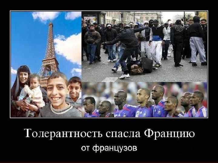 Главная проблема Численность французов с африканскими корнями увеличивается на глазах. Когда приезжие из Африки не работают, им платят пособие. Но от пособия афро-французы получают денег больше , чем от работы. Поэтому они большая опасность для французского народа. Во Франции уже много поколений этих бездельников. Правительство мало что предпринимает , против их тунеядства. n Всё началось после развала Французской Империи, когда колонии из Африки отделились от Франции и французское правительство разрешило африканцам без визы жить во Франции. И любой француз скажет, что ненавидит эту ситуацию в стране. И как говорил один писатель «благими намерениями вымещена дорога в ад» n