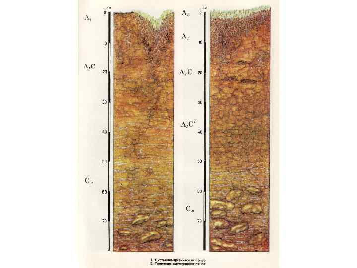 Арктические почвы Почвенный покров в арктической зоне представлен комплексом почв пятен и соответствующих арктических почв под растительностью. Профиль почв, развитый под куртиной ивово мохово злаковой растительности, имеет следующее морфологическое строение: Ао — живая подушка из мха и лишайников мощностью 2— 3 см; A 1 — гумусовый горизонт мощностью 4— 10 см, коричнево бурый, влажный, суглинистый, мелкокомковато зернистый, пористый, тонкотрещиноватый; содержит много корней растений, уплотнен; по трещинам коричнево бурая окраска опускается до глубины 10 см, граница заметная, но неровная; А 1 С` — переходный горизонт мощностью 17— 23 см, светло бурый, суглинистый, влажный, зернистой или комковатой структуры, пористый, тонкотрещиноватый, плотный, иногда присутствуют каверны или трещины (мерзлотного происхождения), вытянутые в горизонтальном направлении; по каналам отмерших корней цвет серовато сизоватый; корней меньше, чем в предыдущем горизонте, иногда встречаются обломки породы; переход заметный; A 1 C" — переходный горизонт мощностью около 20 см, бурый, темно бурый или коричневый, влажный, суглинистый, ореховато глыбистой структуры, плотный; переход по границе оттаивания. С — материнская порода, иногда состоящая из обломков плотных пород, буроватого цвета, суглинистая, мерзлая с многочи сленными кристаллами и линзами льда.