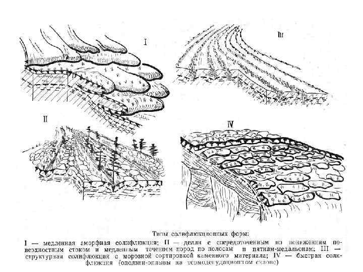 Солифлюкционные отложения (солифлюксий) Солифлюкционными (от лат. solum — почва, грунт; fluxus — течь) называются отложения смещенного переувлажненного обломочного материала на задернованных склонах крутизной менее 35°. Интенсивность движения зависит в основном от характера обломочного чехла и степени увлажненности. Выделяют отложения холодной и теплой солифлюкции. К первым относят образования быстрой, медленной солифлюкции и конжелифлюкций. Общим для их формирования является связь с периодическим промерзанием и оттаиванием грунта.