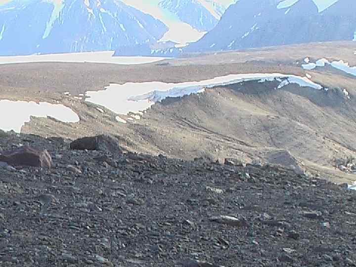 Отложения каменных глетчеров Поверхность каменных глетчеров сложена крупнообломочным материалом. Вниз по разрезу материал становится тоньше. Мощность чехла рыхлых отложений обычно не превышает нескольких метров. Глубже залегает обломочный материал, сцементированный льдом, или чистый лед, мощность которого достигает десятков метров. Характерной особенностью каменных глетчеров является своеобразный микрорельеф поверхности. В их верхней части наблюдаются параллельные продольные гряды высотой до 5— 7 м, повторяющие изгибы каменного глетчера, которые ниже сменяются поперечными грядами в виде концентрических дуг, обращенных выпуклостью вниз по уклону.