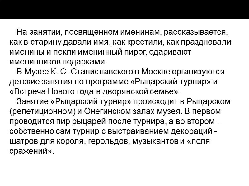 На занятии, посвященном именинам, рассказывается, как в старину давали имя, как крестили, как праздновали именины и пекли именинный пирог, одаривают именинников подарками. В Музее К. С. Станиславского в Москве организуются детские занятия по программе «Рыцарский турнир» и «Встреча Нового года в дворянской семье». Занятие «Рыцарский турнир» происходит в Рыцарском (репетиционном) и Онегинском залах музея. В первом проводится пир рыцарей после турнира, а во втором - собственно сам турнир с выстраиванием декораций - шатров для короля, герольдов, музыкантов и «поля сражений».