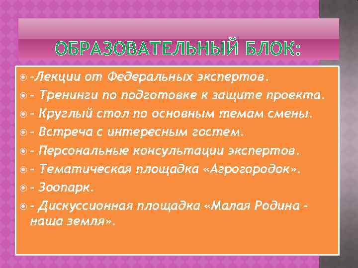 ОБРАЗОВАТЕЛЬНЫЙ БЛОК: -Лекции от Федеральных экспертов. - Тренинги по подготовке к защите проекта. - Круглый стол по основным темам смены. - Встреча с интересным гостем. - Персональные консультации экспертов. - Тематическая площадка «Агрогородок» . - Зоопарк. - Дискуссионная площадка «Малая Родина наша земля» .