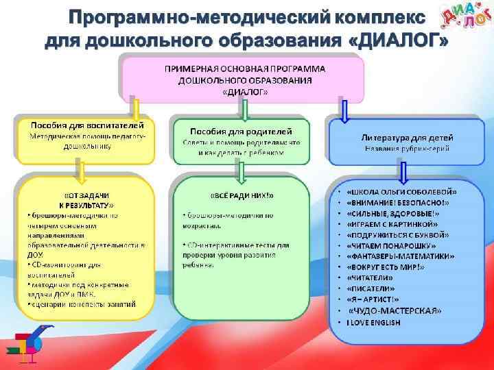 В состав комплекса входят: ü пособия для воспитанников; ü методические разработки для педагогических работников; ü литература для родителей; ü развивающие игры и инновационное оборудование для детей всех возрастных групп.