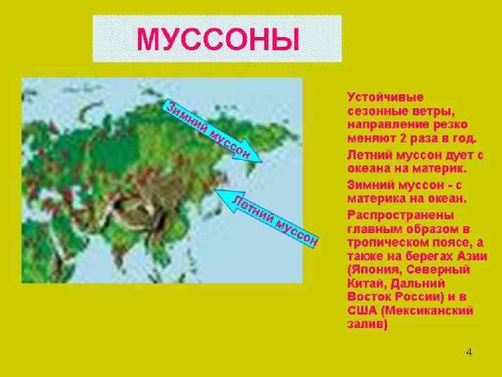 Выводы: По мере прохождения с океана вглубь материка воздушные массы иссушаются, нагреваются (летом) или остывают (зимой) и трансформируются из морских в континентальные. С муссонными воздушными массами может происходить как описанный процесс, так и наоборот. В зависимости от сезона года и направленности ветра: на материк или на океан.