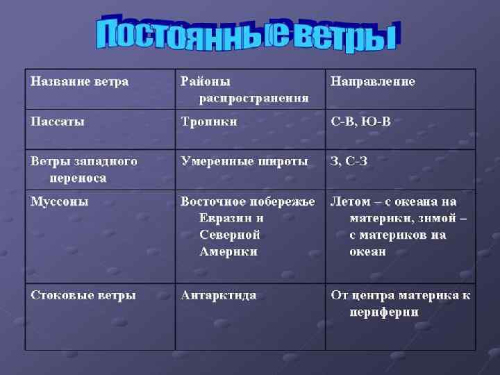 Вывод: • Таким образом, возникают замкнутые кольцао межширотной циркуляции воздушных масс • Охлаждение поднимающихся воздушных масс и нагревание опускающихся обусловливает постоянную высокую влажность экваториального воздуха и чрезвычайную сухость в тропиках. Этот же процесс приводит к формированию различных видов ветров.