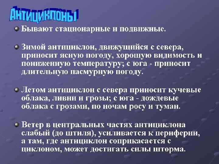 Движение воздуха в антициклоне Антициклоны достигают размера несколько тысяч километров в диаметре. В центре антициклона давление обычно 1020— 1030 мбар, но может достигать 1070— 1080 мбар. Как и циклоны, антициклоны перемещаются запада на восток, отклоняясь при этом к низким широтам. Средняя скорость перемещения антициклона составляет около 30 км/ч в Северном полушарии и около 40 км/ч в Южном, но может надолго принимать малоподвижное состояние – блокирующий.