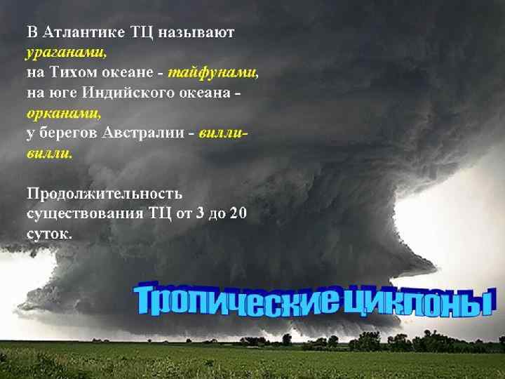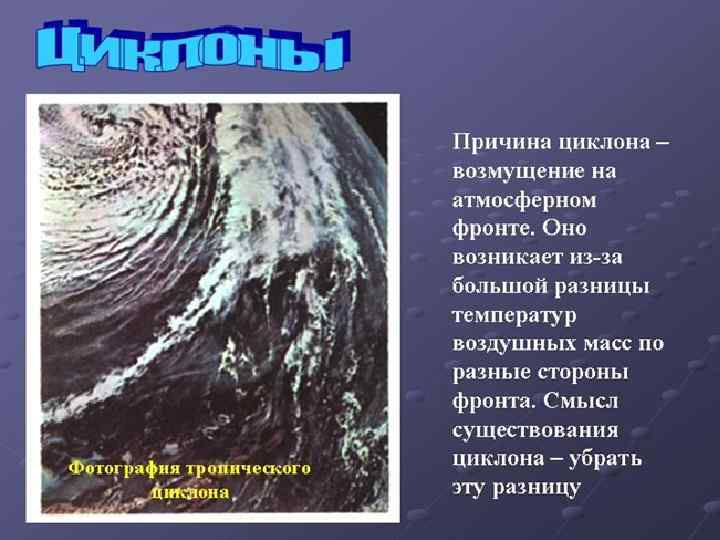 Основные виды циклонов Внетропические циклоны образуются в умеренных или полярных широтах и имеют диаметр от тысячи километров в начале развития, и до нескольких тысяч км. Особенно известны средиземноморские, балканские, черноморские, южнокаспийские и др. циклоны. Южные циклоны обладают колоссальными запасами энергии; и приносят наиболее сильные осадки, ветры, грозы, шквалы и другие явления погоды. Тропические циклоны имеют меньшие размеры (сотни, иногда тысячи километров), но бо льшие барические градиенты и штормовые скорости ветра. Для таких циклонов характерен также т. н. «глаз бури» — центральная область диаметром 20— 30 км с относительно ясной и безветренной погодой. Ниже 8— 10° северной и южной широты циклоны возникают очень редко, а в непосредственной близости от экватора — не возникают совсем.