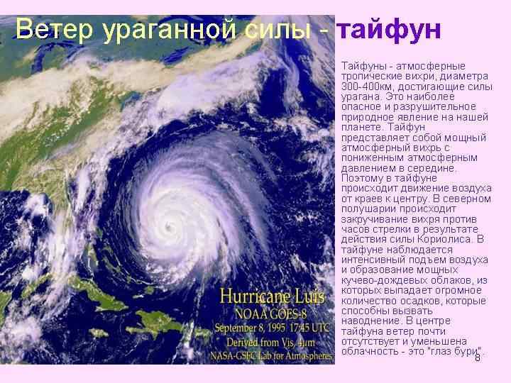 Строение тайфуна Глаз тропических циклонов характеризуется очень низким атмосферным давлением, именно здесь было зарегистрировано самое низкое значение атмосферного давления на уровне земной поверхности (870 г. Па). Воздух глаза тропических циклонов очень теплый, всегда теплее, чем на той же высоте за пределами циклона