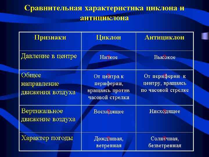Движение воздуха в циклоне Воздух в циклоне циркулирует против часовой стрелки в северном полушарии и по часовой стрелке – в южном. Циклон — не просто противоположность антициклону, у них различается механизм возникновения.