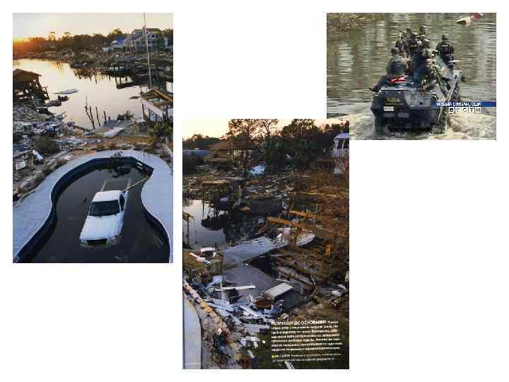 • Разрушительная сила тропических циклонов колоссальна из-за ураганных ветров, ливней и волн, вызывающих наводнения. В результате гибнут люди, разрушаются постройки и дороги, уничтожаются деревья и посевы, страдают морские суда и т. д. Печальной известностью пользуются ураганы «Флора» , «Жаннет» , «Катрина» в Мексиканском заливе, «Вера» и «Ненси» у берегов Японии, «Памела» у острова Тайвань и другие, которые запомнились из-за огромного количества жертв и значительных материальных убытков в результате их действия.