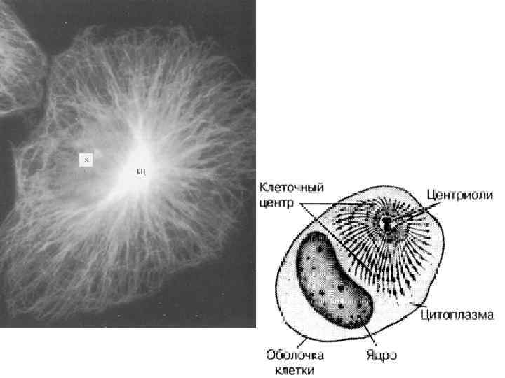 • В неделящейся (интерфазной) клетке система микротрубочек развивается в связи с особой клеточной органеллой — центриолью, которая является местом, где происходит начальная полимеризация тубулинов и рост микротрубочек цитоскелета. Обычно в интерфазных клетках всегда присутствуют две центриоли, располагающиеся рядом друг с другом, образуя диплосому. В диплосоме центриоли располагаются под прямым углом по отношению друг к другу. Из двух центриолей различают материнскую и дочернюю. Обе центриоли сближены и расположены так, что конец дочерней центриоли направлен к поверхности материнской центриоли.