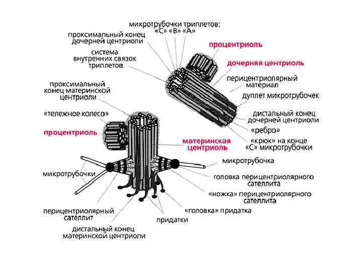 • Центриоли • Этот термин был предложен Т. Бовери в 1895 г. для обозначения очень мелких телец, размер которых находится на границе разрешающей способности светового микроскопа. В некоторых объектах удавалось видеть, что мелкие плотные тельца — центриоли (centriolum), обычно расположенные в паре — т. н. диплосома (diplosoma), окружены зоной более светлой цитоплазмы, от которой отходят радиально тонкие фибриллы (т. н. центросфера). Совокупность центриолей и центросферы называют клеточным центром (cytocentrum). Эти органеллы в делящихся клетках принимают участие в формировании веретена деления и располагаются на его полюсах. В неделящихся (интерфазных) клетках центриоли часто определяют полярность клеток, например, эпителия, и располагаются вблизи комплекса Гольджи.