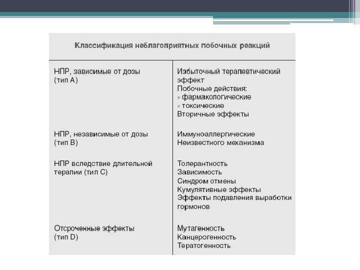 Лекарственные ятрогении 1) фармакологически негативные эффекты (например, гипогликемический шок после введения инсулина) 2) лекарственные интоксикации, включая токсическое, мутагенное, онкогенное, тератогенное, эмбриотоксическое, иммунодепрессивное действие 3) лекарственная аллергия 4) лекарственная непереносимость псевдоаллергической природы 5) лекарственная зависимость 6) лекарственные психозы 7) реакции обострения, например бактериальный (эндотоксический) шок 8) осложнения основной болезни, вызванные физикохимической, фармакодинамической и фармакокинетической несовместимостью одновременно вводимых лекарств 9) поствакцинальные реакции и осложнения