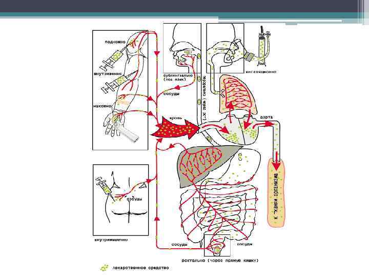Пути введения лекарственных средств Энтеральные • Внутрь, или пероральный • Сублингвальный • Ректальный Парентеральные • Подкожный • Внутримышечный • Внутривенный • Субарахноидальный • Ингаляционный • Внутриартериальный • Внутрикостный • Введение в полости тела (в полость брюшины, в плевральную полость) • Интраназальный • Местное применение • Электрофорез
