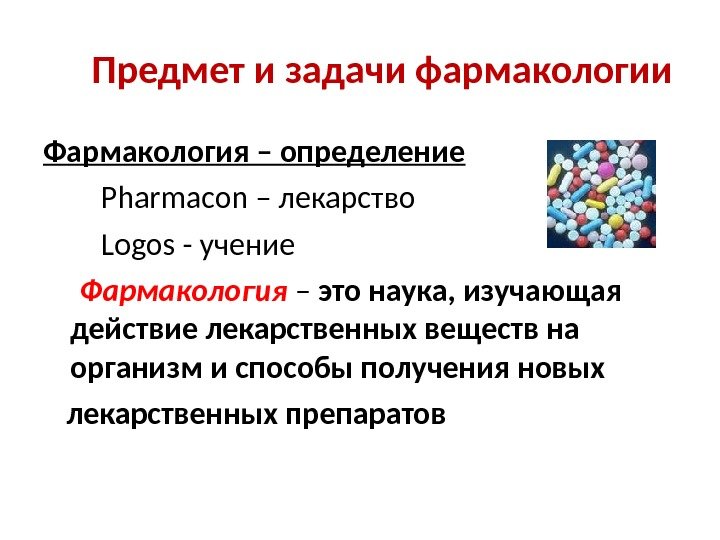 Предмет и задачи фармакологии Фармакология – определение Pharmacon – лекарство Logos — учение Фармакология – это наука, изучающая действие лекарственных веществ на организм и способы получения новых лекарственных препаратов