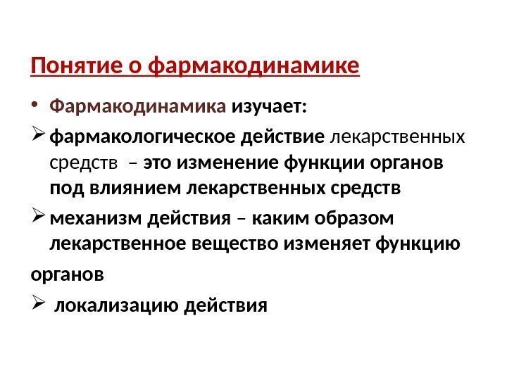 Понятие о фармакодинамике • Фармакодинамика изучает: фармакологическое действие лекарственных средств – это изменение функции органов под влиянием лекарственных средств механизм действия – каким образом лекарственное вещество изменяет функцию органов локализацию действия