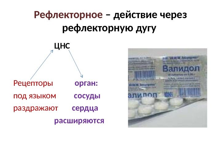Рефлекторное – действие через рефлекторную дугу ЦНС Рецепторы орган: под языком сосуды раздражают сердца расширяются