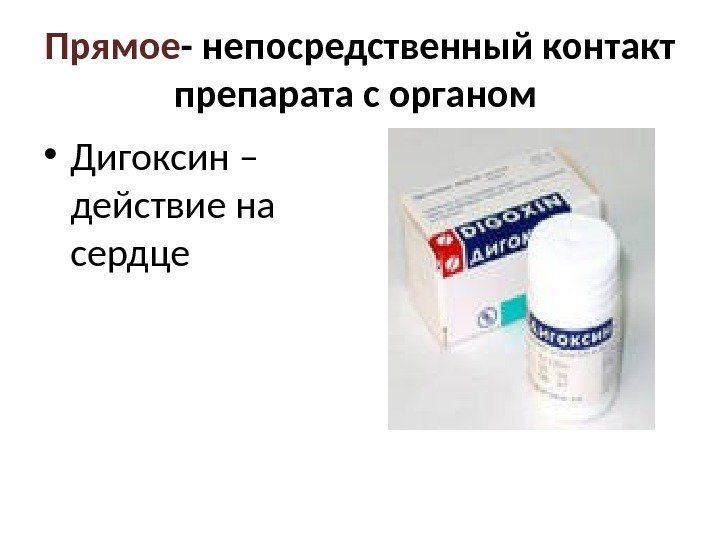 Прямое — непосредственный контакт препарата с органом • Дигоксин – действие на сердце