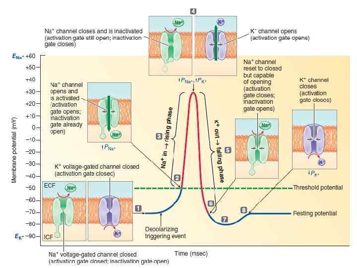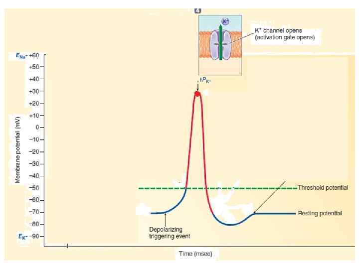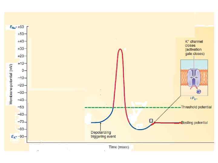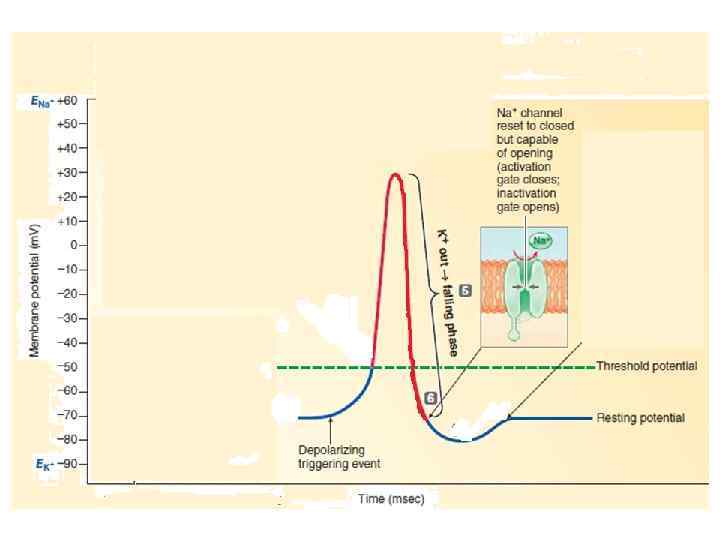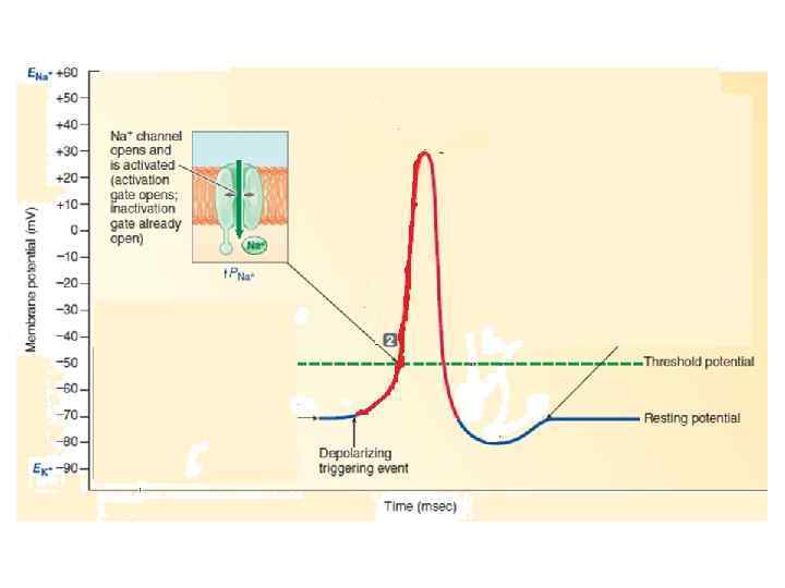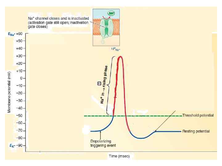 Фаза деполяризации. Начинается вход de Na +; потенциал мембраны инверсируется Na + ворота открыты; K + ворота закрыты Пока заряд не доходит до критического значения ( 55 à 50 m. V)