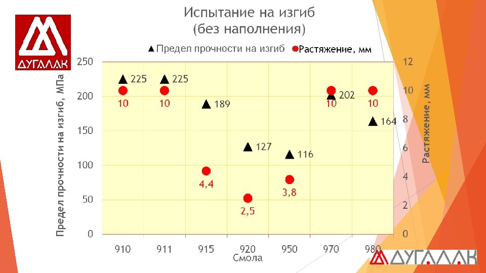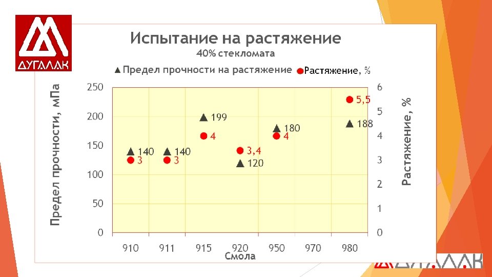 Девинил 980 Ashland Derakane 8084 79. 5 72 Удлинение при разрыве, % 5 6. 3 Прочность на изгиб, м. Па*с 164 129 Удлинение при изгибе, % 10 12 Температура термической деформации (HDT), °С - Отливки: Прочность на разрыв, м. Па*с Твердость по Барколу 30 30 Вязкость, спз 350 360 Удельный вес 1, 05 45 40 Свойства жидкой смолы: Содержание стирола, %