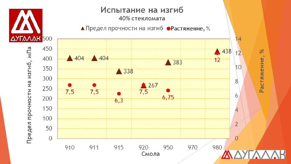 СРАВНЕНИЕ ДЕВИНИЛ 915 с ДЕРАКАНЕ 441 * с 40% стекломата и термообработкой 3 ч. на 80 ᵒС Девинил 915 Деракане Ед. изм. 441 Содержание стирола 34 34 % HDT 120 114 ᵒC 199, 6 165, 6 м. Па 4 4, 5 % Предел прочности на изгиб* 338 313 м. Па Удлинение на изгиб 6, 3 8 % Предел прочности на растяжение* Удлинение на растяжение