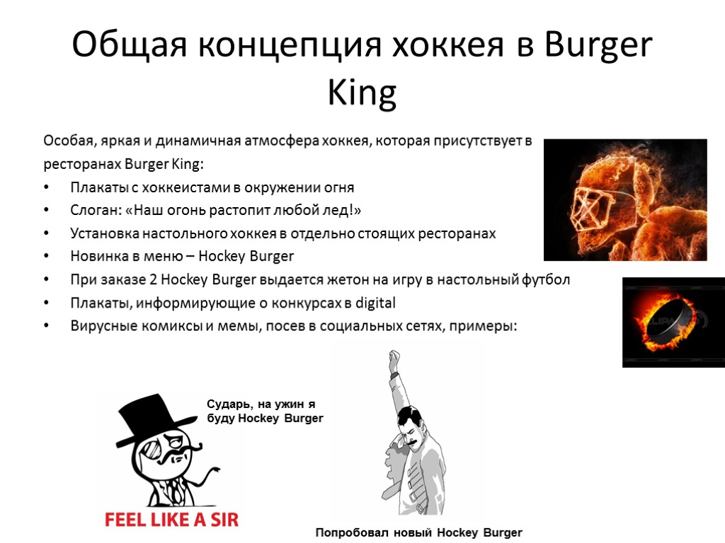 Общая концепция хоккея в Burger King Особая, яркая и динамичная атмосфера хоккея, которая присутствует в ресторанах Burger King: Плакаты с хоккеистами в окружении огня Слоган: «Наш огонь растопит любой лед!» Установка настольного хоккея в отдельно стоящих ресторанах Новинка в меню – Hockey Burger При заказе 2 Hockey Burger выдается жетон на игру в настольный футбол Плакаты, информирующие о конкурсах в digital Вирусные комиксы и мемы, посев в социальных сетях, примеры: Попробовал новый Hockey Burger Сударь, на ужин я буду Hockey Burger