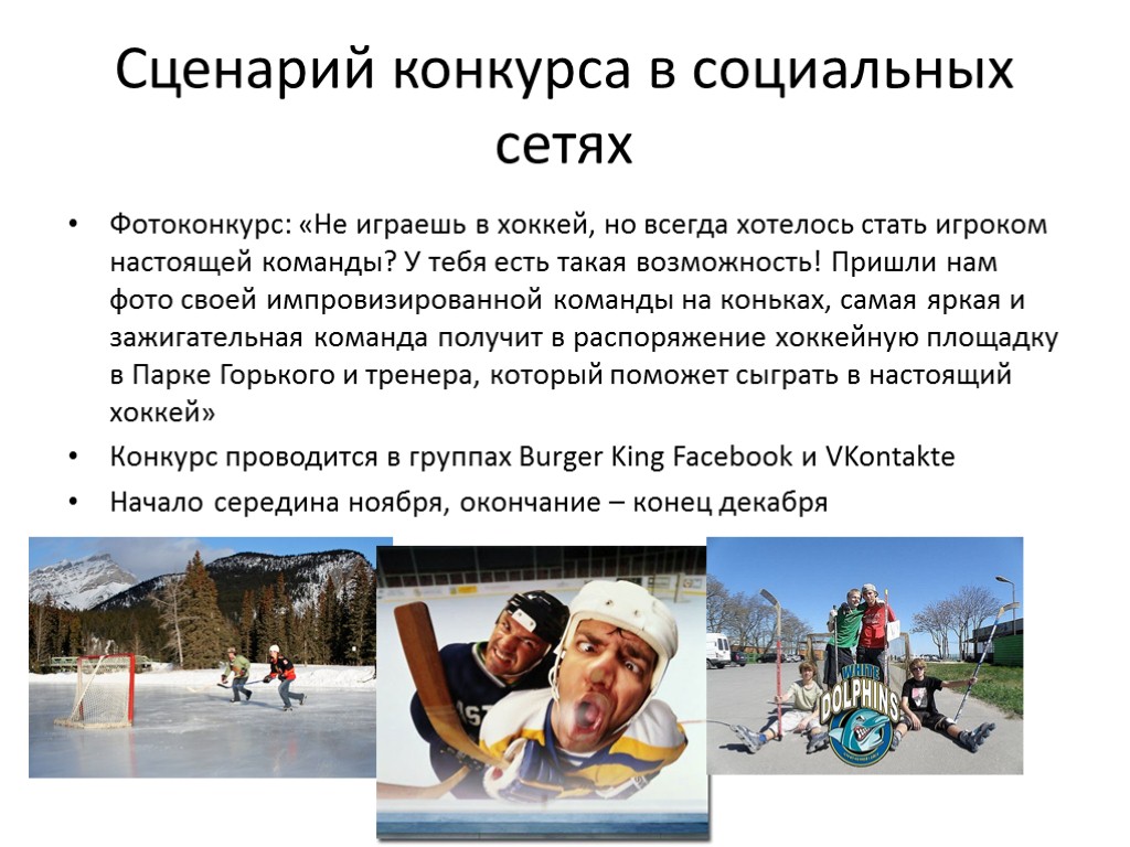 Сценарий конкурса в социальных сетях Фотоконкурс: «Не играешь в хоккей, но всегда хотелось стать игроком настоящей команды? У тебя есть такая возможность! Пришли нам фото своей импровизированной команды на коньках, самая яркая и зажигательная команда получит в распоряжение хоккейную площадку в Парке Горького и тренера, который поможет сыграть в настоящий хоккей» Конкурс проводится в группах Burger King Facebook и VKontakte Начало середина ноября, окончание – конец декабря
