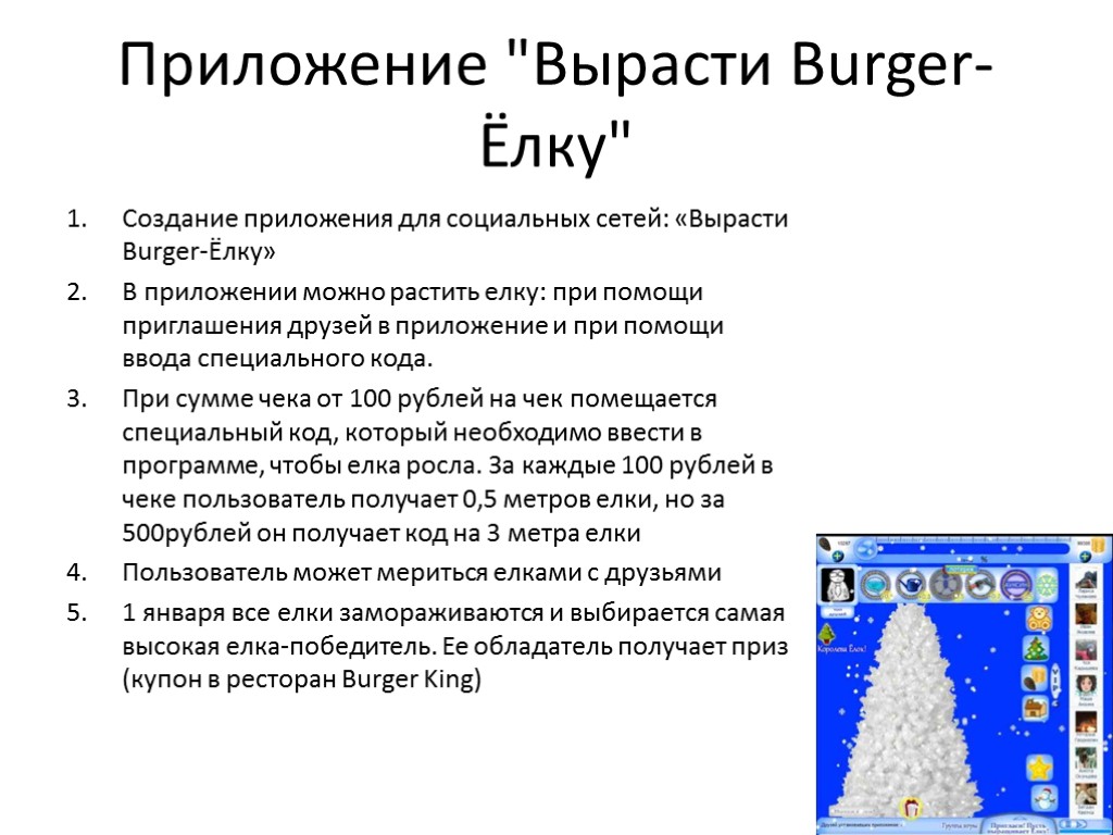 Приложение "Вырасти Burger-Ёлку" Создание приложения для социальных сетей: «Вырасти Burger-Ёлку» В приложении можно растить елку: при помощи приглашения друзей в приложение и при помощи ввода специального кода. При сумме чека от 100 рублей на чек помещается специальный код, который необходимо ввести в программе, чтобы елка росла. За каждые 100 рублей в чеке пользователь получает 0,5 метров елки, но за 500рублей он получает код на 3 метра елки Пользователь может мериться елками с друзьями 1 января все елки замораживаются и выбирается самая высокая елка-победитель. Ее обладатель получает приз (купон в ресторан Burger King)