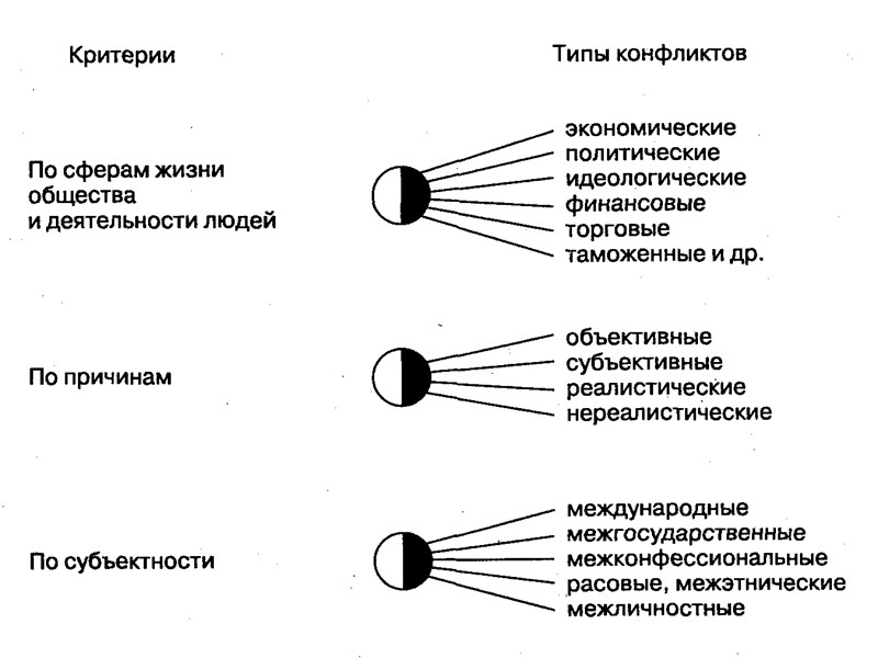 Веер типов социального конфликта ложный конфликт — субъект воспринимает ситуацию как конфликтную, хотя реальных причин для конфликта нет; потенциальный конфликт — существуют реальные основания для возникновения конфликта, но пока одна из сторон или обе стороны в силу тех или иных причин (например, из-за недостатка информации) еще не осознали ситуацию как конфликтную; истинный конфликт — реально возникшее столкновение между сторонами. В свою очередь истинный конфликт можно разделить на следующие подвиды: конструктивный конфликт, возникший на основе реально существующих между субъектами противоречий случайный конфликт — конфликт, возникший по недоразумению или случайному стечению обстоятельств; смещенный конфликт — конфликт, возникший на ложном основании, когда истинная причина конфликта скрыта неверно приписанный конфликт — это конфликт, в котором истинный виновник, субъект конфликта находится за «кулисами» противоборства, а в конфликте задействованы участники, не имеющие отношения к конфликту.
