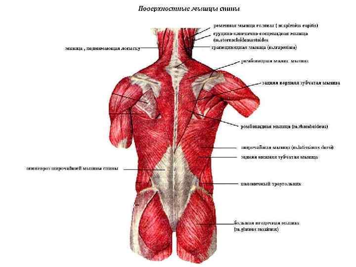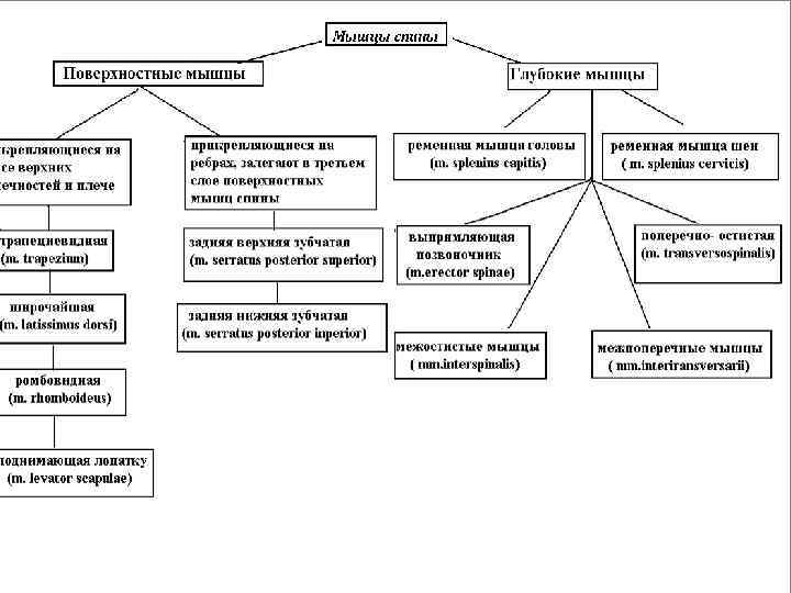 Поверхностные мышцы спины • Широчайшая мышца спины начинается на гребне подвздошной кости, на остистых отростках всех поясничных и шести нижних грудных позвонков (тянет руку и плечо назад, одновременно поворачивая ее внутрь). • Ромбовидные мышцы начинаются на остистых отростках нижних шейных и четырех верхних грудных позвонков (поднимает лопатку, приближает ее к срединной линии); • Верхняя задняя зубчатая мышца находится под ромбовидными мышцами (тянет II—V ребра вверх, участвуя в акте вдоха); • Нижняя задняя зубчатая мышца лежит под широчайшей мышцей спины (тянет ребра вниз, участвуя в акте выдоха) • Трапециевидная мышца – расположена в верхней части спины (ее верхняя часть поднимает лопатку, нижняя – опускает, средняя – приближает к позвоночнику).