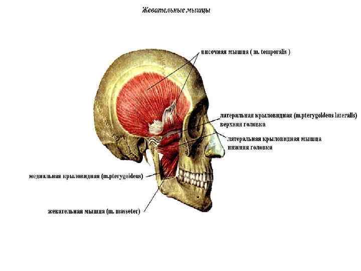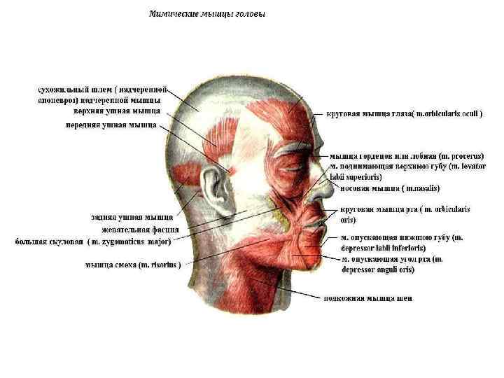 Мышцы головы делятся на 2 группы: • жевательные (височная, жевательная, мышцы). Поднимают нижнюю челюсть, участвуют в пережевывании пищи. • мимические (круговая мышца рта, круговая мышца глаза, скуловая, мышца смеха, щечная, квадратные). Благодаря им человек выражает эмоции: гнев, горе, радость. Участвуют в акте дыхания и речи.