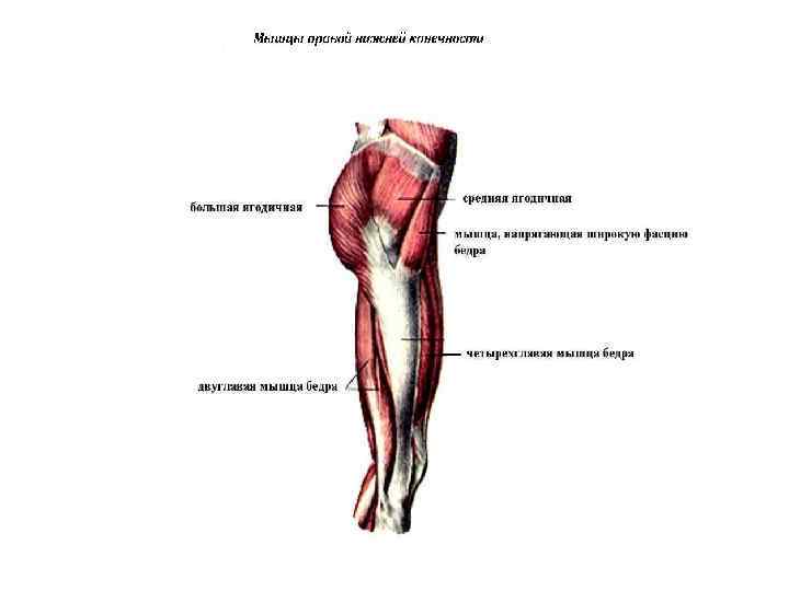 Наружных мышц тазобедренной области шесть: • Большая ягодичная мышца - вращает бедро кнаружи, одновременно разгибая его; • Средняя и малая ягодичные - отводят бедро; • Наружная запирательная мышца - вращает бедро кнаружи; • Квадратная мышца бедра - вращая бедро кнаружи; • Напрягатель широкой фасции бедра напрягает фасции бедра.