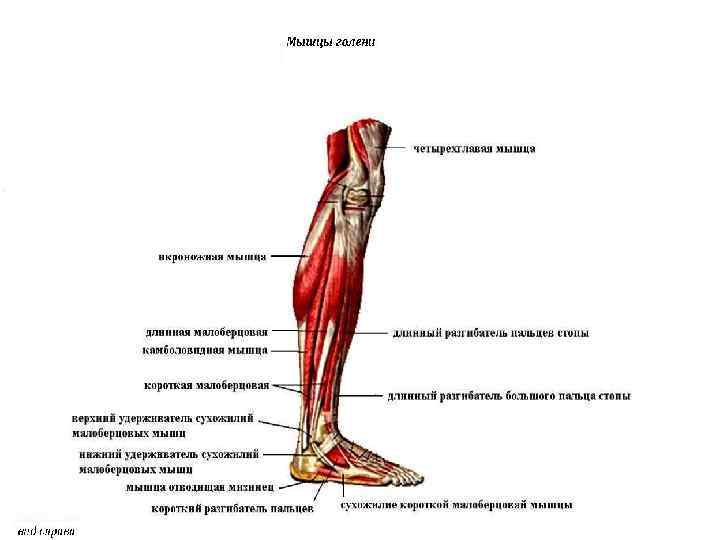 Мышцы голени • Передняя группа - представлена тремя мышцами: передней большеберцовой, длинным разгибателем пальцев и длинным разгибателем большого пальца (сгибает стопу, производят тыльное сгибание стопы и разгибание пальцев). • Задняя группа состоит из четырех мышц: трехглавой мышцы голени, задней большеберцовой, длинного сгибателя пальцев и длинного сгибателя большого пальца (подошвенное сгибание в голеностопном суставе). • Латеральная группа состоит из двух мышц — длинной и короткой малоберцовых (сгибании стопы).