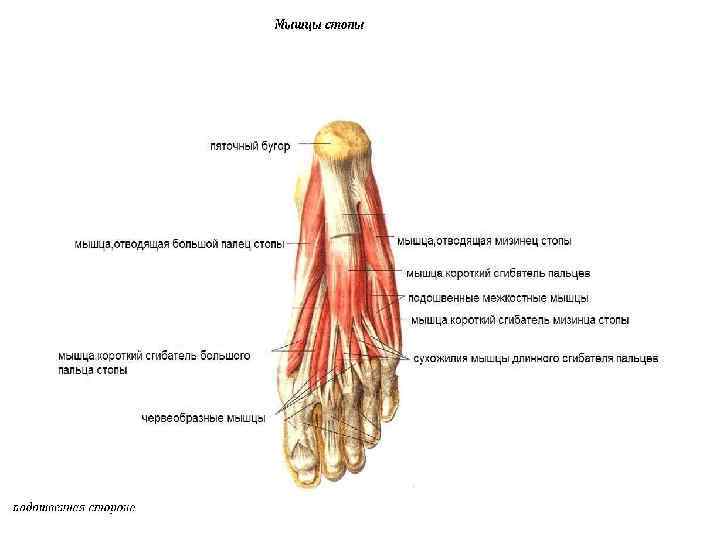 Мышцы стопы Тыльные – короткий разгибатель пальцев (разгибает пальцы стопы) Мышцы большого пальца (отводящая мышца, приводящая мышца и короткий сгибатель большого пальца) Подошвенные Мышцы мизинца (отводящая мышца мизинца, короткий сгибатель и мышца, противопоставляющая мизинец) Средняя группа мышц, лежащая в углублении подошвы (коротким сгибателем пальцев, квадратной мышцей подошвы, четырьмя червеобразными мышцами и др. )