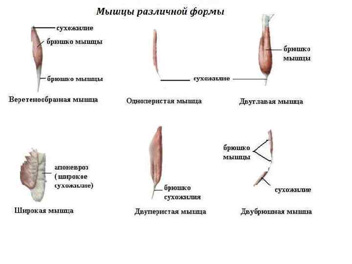 Форма мышц: 1 — веретенообразная; 2 — лентовидная; 3 — двубрюшная; 4 — двуглавая; 5 — одноперистая; 6 — двуперистая; 7 — широкая; 8 — сжиматель (сфинктер)